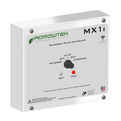 GrowControl™ MX1i motor controllers are intelligent reversing controllers for operating ridge vents, curtains, sidewalls and other motors for forward/reverse motion. Connects instantly to Agrowtek's GCX Cultivation Controls via a GrowNET™ port for advanced automated control functions. Internal microprocessor tracks position movements even when override knob is manually operated. Status of manual override knob is returned to the master GCX control system to notify of an override condition.