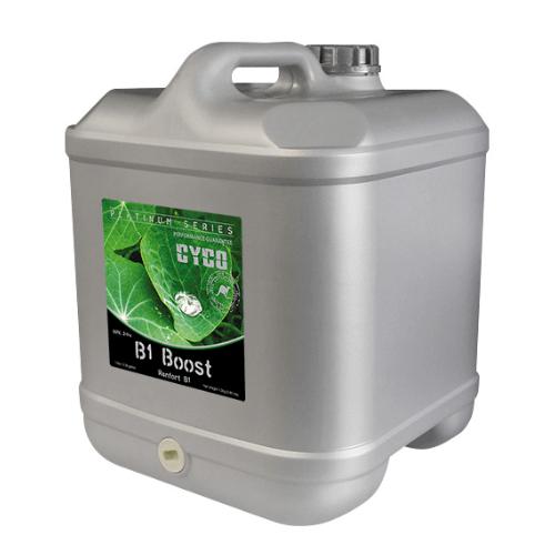 Cyco Platinum Series B1 Boost is an additive used throughout the vegetative and flowering periods of plant growth. Used at higher concentrations in vegetative growth than flowering, B1 Boost contains high amounts of the natural vitamin B1, also known as thiamine. Thiamine is a natural hormone that is present in the plant, natural bacteria excrements and native fungi. By providing a constant presence of thiamine, root growth is encouraged, thereby allowing for healthy new growth. B1 Boost is also a strong source of pharmaceutical-grade potassium. A necessary ingredient to plant growth enzymes, protein formation and the translocation of sugars, potassium in B1 Boost allows for vibrant, healthy growth.