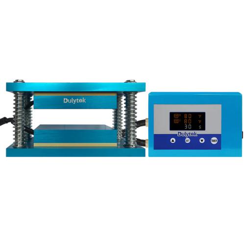 Dulytek® Retrofit Rosin Two Channel Heat Caged Plate Kit works with 10 to 20 ton hydraulic or pneumatic (air-operated) shop presses (not included) and comes with a compact temperature and timer controller. The kit is equipped with 3 by 6 insulated anodized aluminum plates capable of squashing up to an ounce (30 grams) of plant material per load at a low temperature offering high yields and exceptional flavor and aroma. The temperature/timer control module regulates heat plates separately and features magnetic feet for easy mounting anywhere on your press. This unit is perfect for people to take advantages of their shop presses to maximize their solventless yields, extract the highest quality materials, and press larger quantities at once.