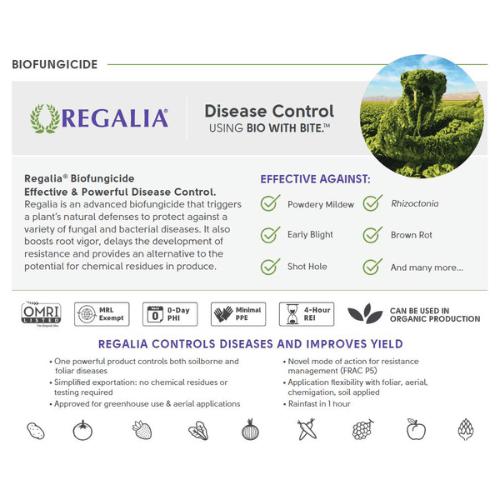 REGALIA® advanced biofungicides activate a plant’s natural defenses to protect against a variety of fungal and bacterial diseases, resulting in higher quality AND yields. REGALIA®products are active against both soilborne and foliar pathogens, delay the development of resistance, and help minimize chemical residues. They can be used as stand-alone products or in combination with other fungicides to strengthen integrated pest management programs (IPM) and to help manage resistance in a wide range of organic and conventional crops, as well as in turf and ornamentals.